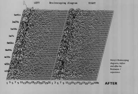 Naquele fim de tarde, levamos Harry para o curso. Ele foi ligado a uma tela de Eletroencefalograma (EEG) que registrava um desequilíbrio ativo entre os hemisférios esquerdo e direito enquanto ele desenhava. Ele então se sentou para usar o Brainwave I com uns óculos e um fone de ouvido que agiam sincronizadamente. Ele estava feliz e relaxado e poderia tê-